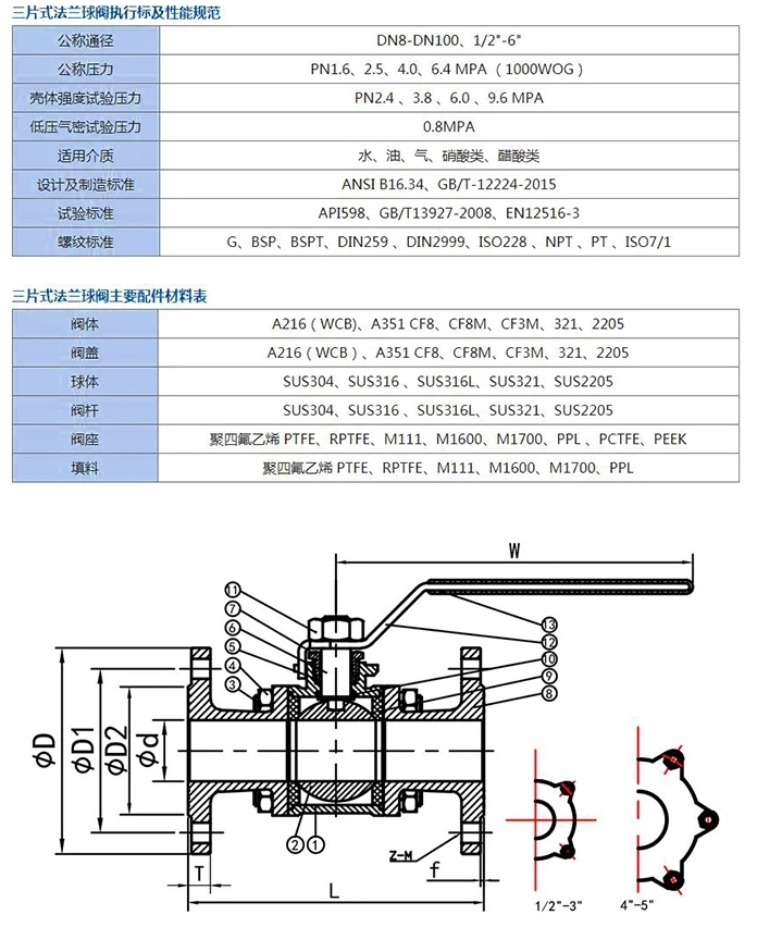 進(jìn)口三片式法蘭球閥結(jié)構(gòu),對(duì)裝在管道上的閥門可直接在線檢查與維修,能有效減少裝置停車,降低成本; 三片式球閥楔形密封結(jié)構(gòu),閥門是靠閥桿提供的機(jī)械力,將球楔壓到閥座上而密封,使閥門的密封性不受管線壓差變化的影響,在各種工況下密封性能都有可靠保證。 三片式法蘭球閥單閥座設(shè)計(jì),消除了閥門中腔介質(zhì)因異常升壓而影響使用安全的問題;三片式美標(biāo)球閥低扭矩設(shè)計(jì),特殊結(jié)構(gòu)設(shè)計(jì)的閥桿,只需配一個(gè)小手把閥門就能輕松啟閉;啟閉無摩擦,這一功能完全解決了傳統(tǒng)閥門因密封面之間相互摩擦而影響密封的問題
