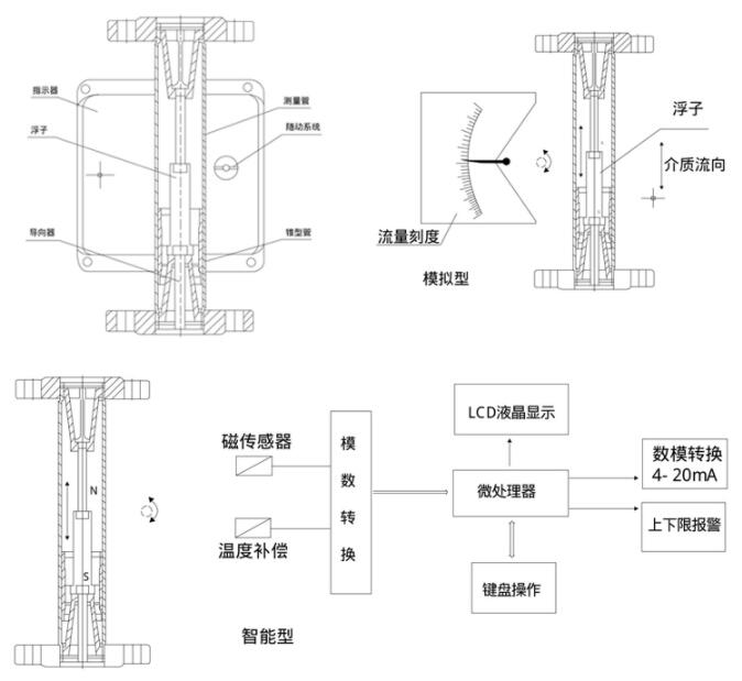 流量計(jì)主要有三大部分組成:1.測量管體;2.錐形浮子;3.指示器。浮子的位移量與流量大小成正比,通過磁耦合系統(tǒng),以不接觸方式,將浮子位移量傳給指示器指出流量大小。也可配合不同的轉(zhuǎn)換器,將流量值轉(zhuǎn)換成標(biāo)準(zhǔn)的電遠(yuǎn)傳信號(hào)如4-20mA。實(shí)現(xiàn)距離遠(yuǎn)傳顯示、記錄、積算和控制等功能。
