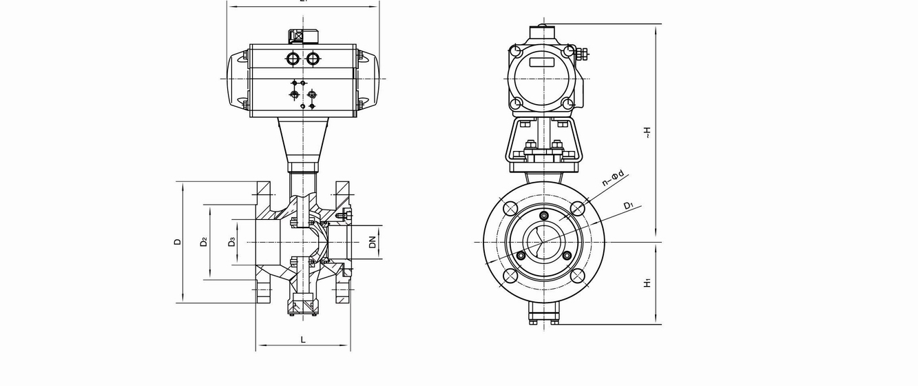 進(jìn)口氣動(dòng)對(duì)夾式調(diào)節(jié)球閥結(jié)構(gòu)尺寸: