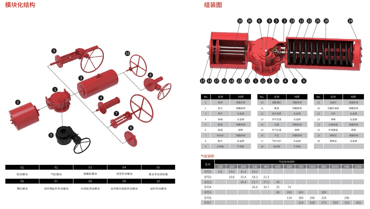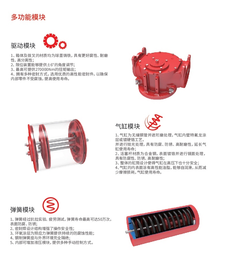 BTS系列氣動(dòng)執(zhí)行器可拆分為驅(qū)動(dòng)模塊、氣缸模塊、彈簧缸模塊、手動(dòng)裝置等獨(dú)立模塊,根據(jù)客戶個(gè)性化需求進(jìn)行安裝、維修。
