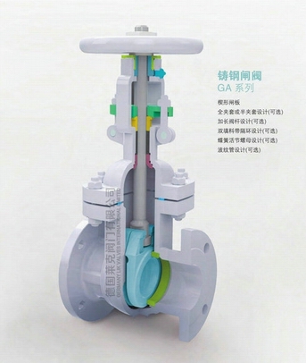 國標閘閥的啟閉件是閘板,閘閥閘板的運動方向與流體方向相垂直,國標閘閥只能作全開和全關,不能作調節(jié)和節(jié)流。大部分閘閥是采用強制密封的,即閥門關閉時,要依靠外力強行將閘板壓向閥座, 以保證密封面的密封性。閘板有兩個密封面,最常用的模式閘板閥的兩個密封面形成楔形、楔形角隨閘閥參數而異,通常為50,介質溫度不高時為2°52'。楔式國標閘閥的閘板可以做成一個整體,叫做剛性閘板;也可以做成能產生微量變形的閘板,以改善其工藝性,彌補密封面角度在加工過程中產生的偏差,這種閘板叫做彈性閘板。